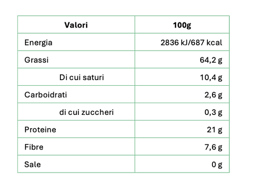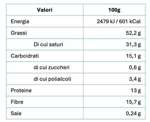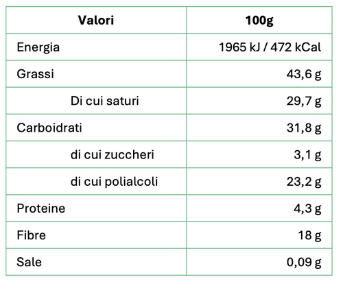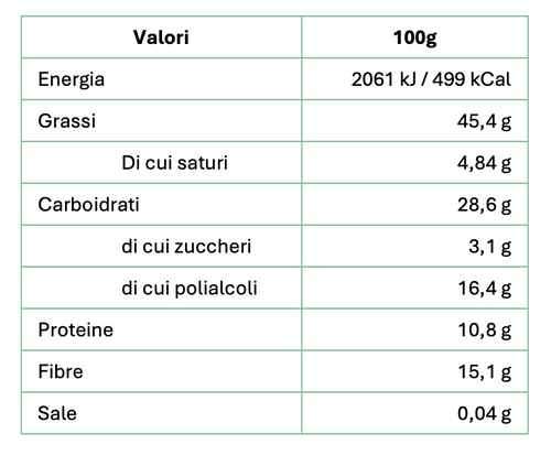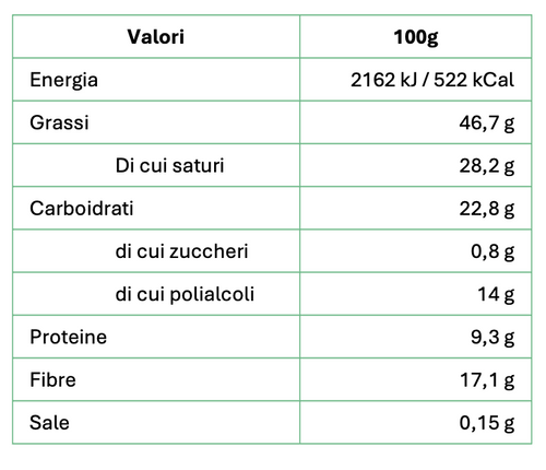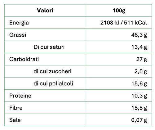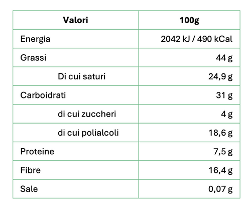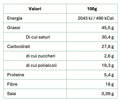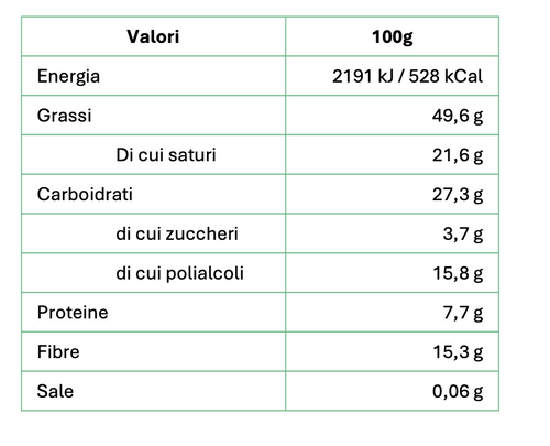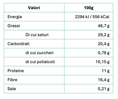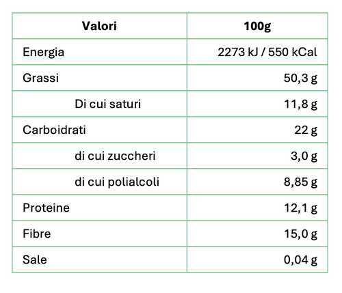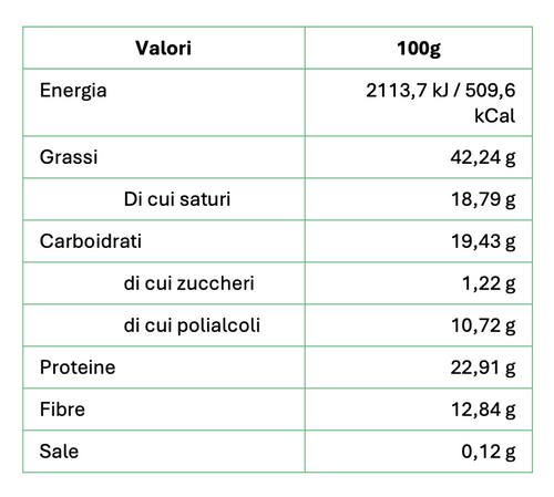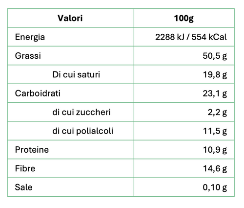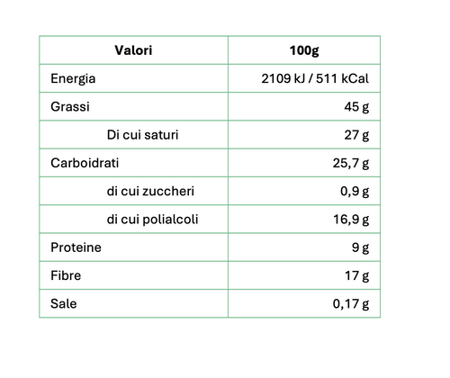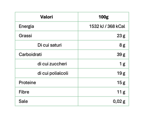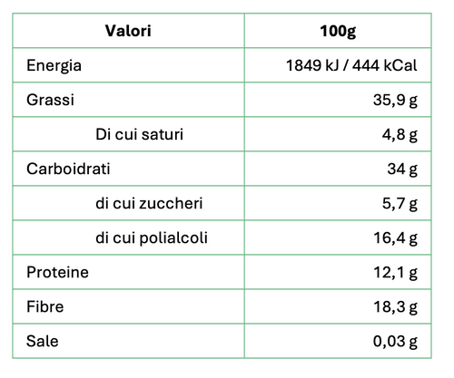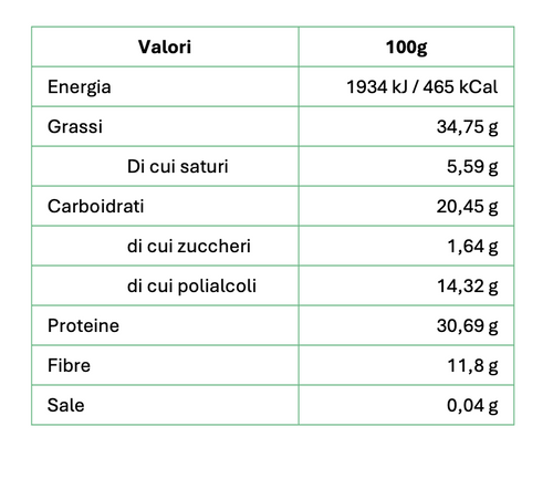 32% proteine 12% fibra Senza zucchero Senza olio di palma Basso contenuto di sale Il miglior cacao della prestigiosa qualità Arriba dell'Ecuador viene lavorato artigianalmente dai mastri cioccolatai piemontesi dando vita a una crema spalmabile dalla consistenza morbida e vellutata arricch...